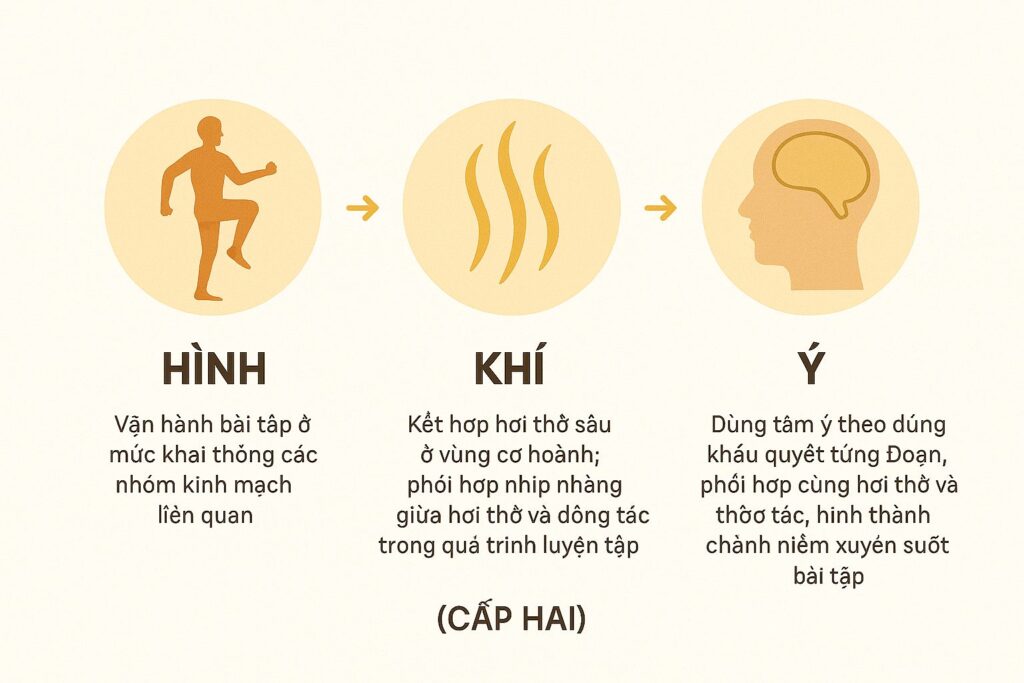 - Ý: Dùng tâm ý theo đúng khẩu quyết từng Đoạn, phối hợp cùng hơi thở và động tác, hình thành chánh niệm xuyên suốt bài tập.